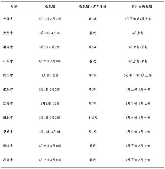 今年,長江流域冬油菜種植面積為9446萬畝,各省平均感病品種比率為65.9 %,比上年增加0.9個百分點。目前,云南、貴州、湖南、江西、湖北、安徽,以及浙江南部處于盛花期至花莢期,四川、重慶、江蘇、河南、陜西、上海,以及浙江北部處于始花期至盛花期,與上年同期相比,大部分地區(qū)花期比常年提早3-7天,最高提早10天,花器易感期與子囊孢子發(fā)生期相吻合時間長,有利于病菌侵染。預(yù)計各地花期和發(fā)病盛期見表2。