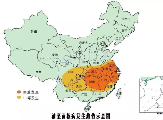 1.重發(fā)區(qū):以長江流域秋播油菜產(chǎn)區(qū)湖北、湖南、安徽、江蘇、江西為菌核病重發(fā)區(qū),注意重點防控。