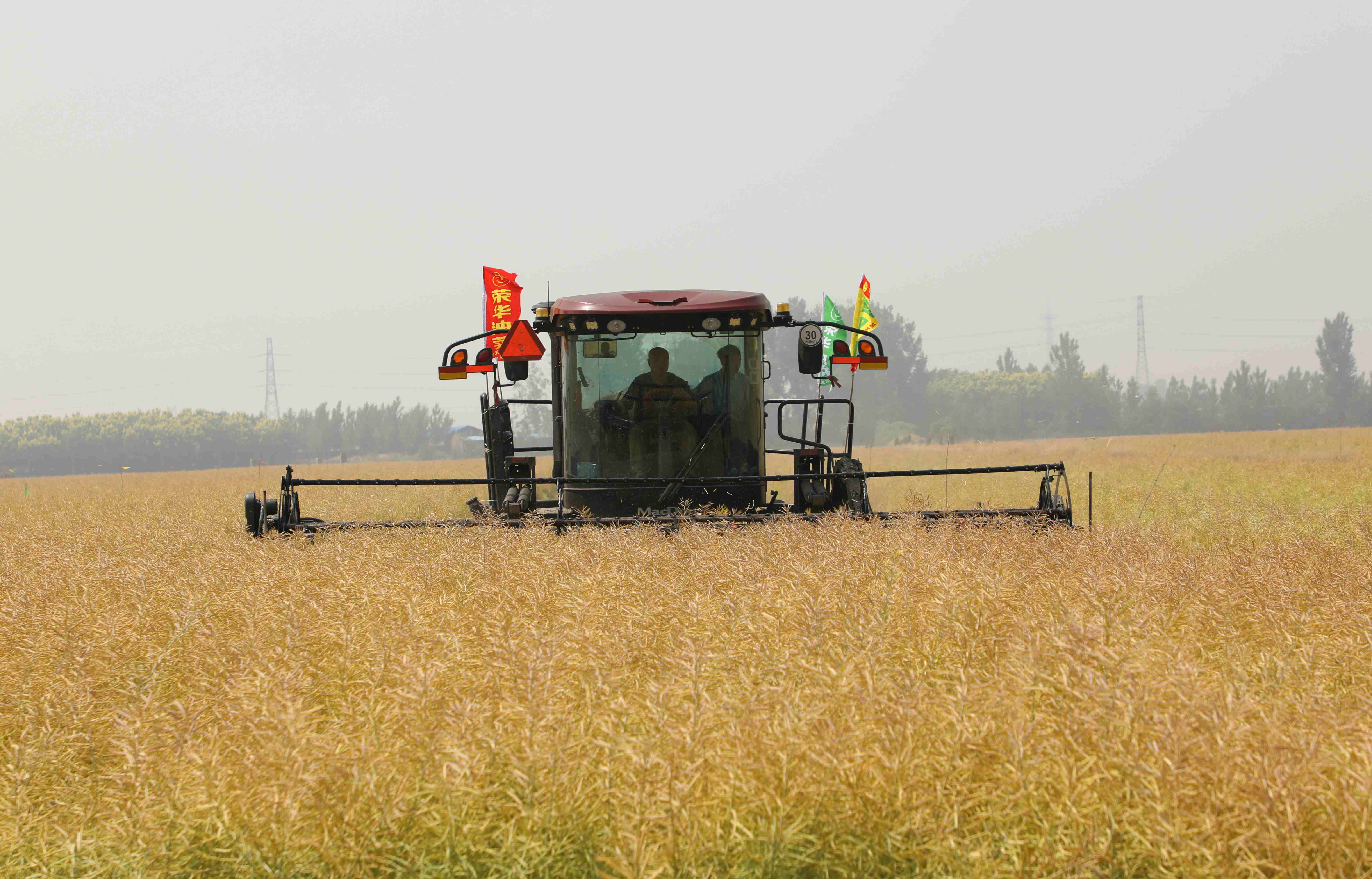 5月26日,河南省新鄉(xiāng)市鳳泉區(qū)大塊鎮(zhèn)東莊村的6000畝金鳳凰油菜喜獲豐收。金燦燦的油菜莢顆粒飽滿、壓彎枝干。種植戶正用大型機(jī)械收割、撿拾,確保顆粒歸倉(cāng)。