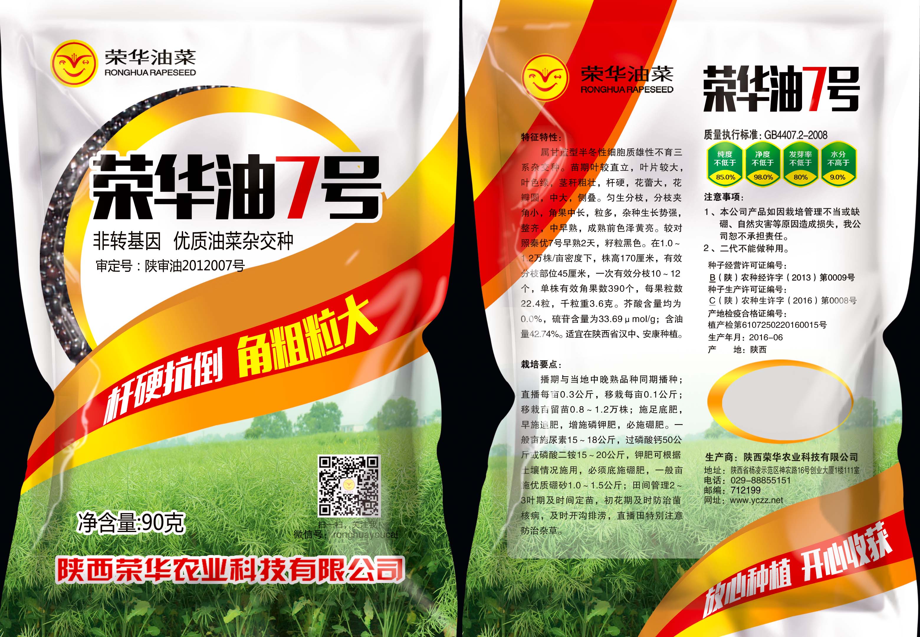 榮華油7號(審定編號:陜審油2012007)是陜西榮華農業科技有限公司自主選育的甘藍型、半冬性細胞質雄性不育三系雜交種,適宜在陜西漢中、安康和生態類型相似區域種植。該品種分枝部位低、分枝數多、分枝夾角小、株型緊湊、適合密植和機械化收割,抗倒性強,中抗菌核病,是目前生產上輕簡化栽培的最優品種之一。